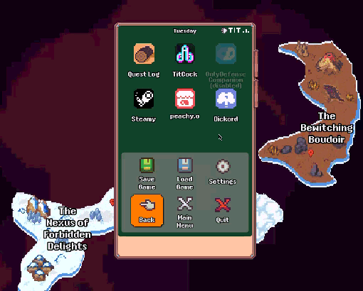 Through TitCock, you can check on Marty's stats as they develop, but let's be real, more importantly for all you pervs out there, you'll be able to stalk (follow) your friends (daytime characters) and foes* (nighttime). As you play the game, the app will update with all the characters you meet, and more importantly (for all the pervs out there), you can replay all the saucy illustrations you unlocked through dialogues, whenever you're in the mood for a little... inspiration. (We know you want to)